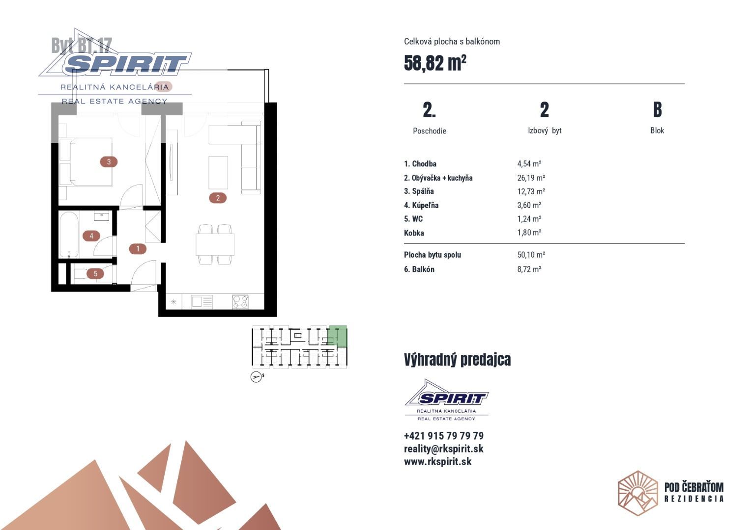 Realitná kancelária RK SPIRIT Vám ponúka na predaj 2-izbový byt nachádzajúci sa na 2. poschodí, v bloku B, v jedinečnom bytovom projekte Rezidencia pod Čebraťom. Byt o výmere 48,30 m2 pozostáva z chodby, obývacej izby s kuchyňou, samostatnej spálne, kúpeľne, WC a kobky (skladu) o výmere 1,80 m2 nachádzajúcej sa na prízemí domu. K bytu prislúcha aj balkón o výmere 8,72 m2.