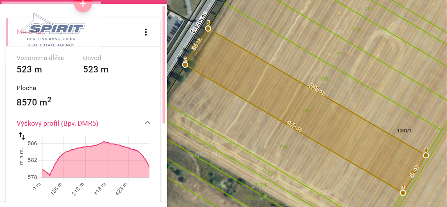 Pozemok je rovinatý, má obdĺžnikový tvar a je vedený ako orná pôda. Vzhľadom na svoju výnimočnú polohu a charakter predstavuje zaujímavú príležitosť pre developerov alebo stavebné spoločnosti. Po zmene v územného plánu môže byť vhodný na výstavbu rekreačných alebo ubytovacích zariadení.