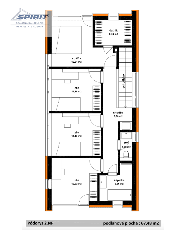 Na prvom poschodí sa nachádza chodba, štyri samostatné izby, šatník, kúpeľňa a samostatné WC, čo zabezpečuje dostatok súkromia aj pre väčšiu rodinu.
