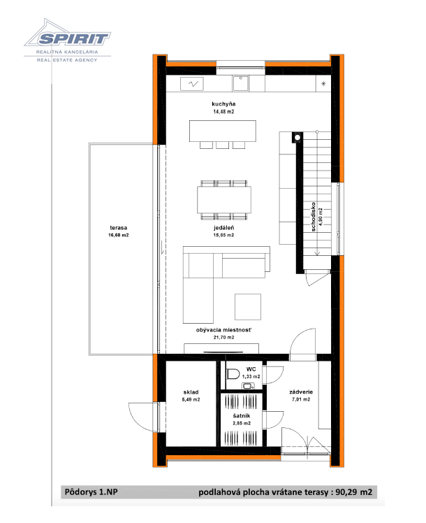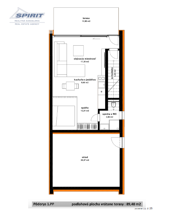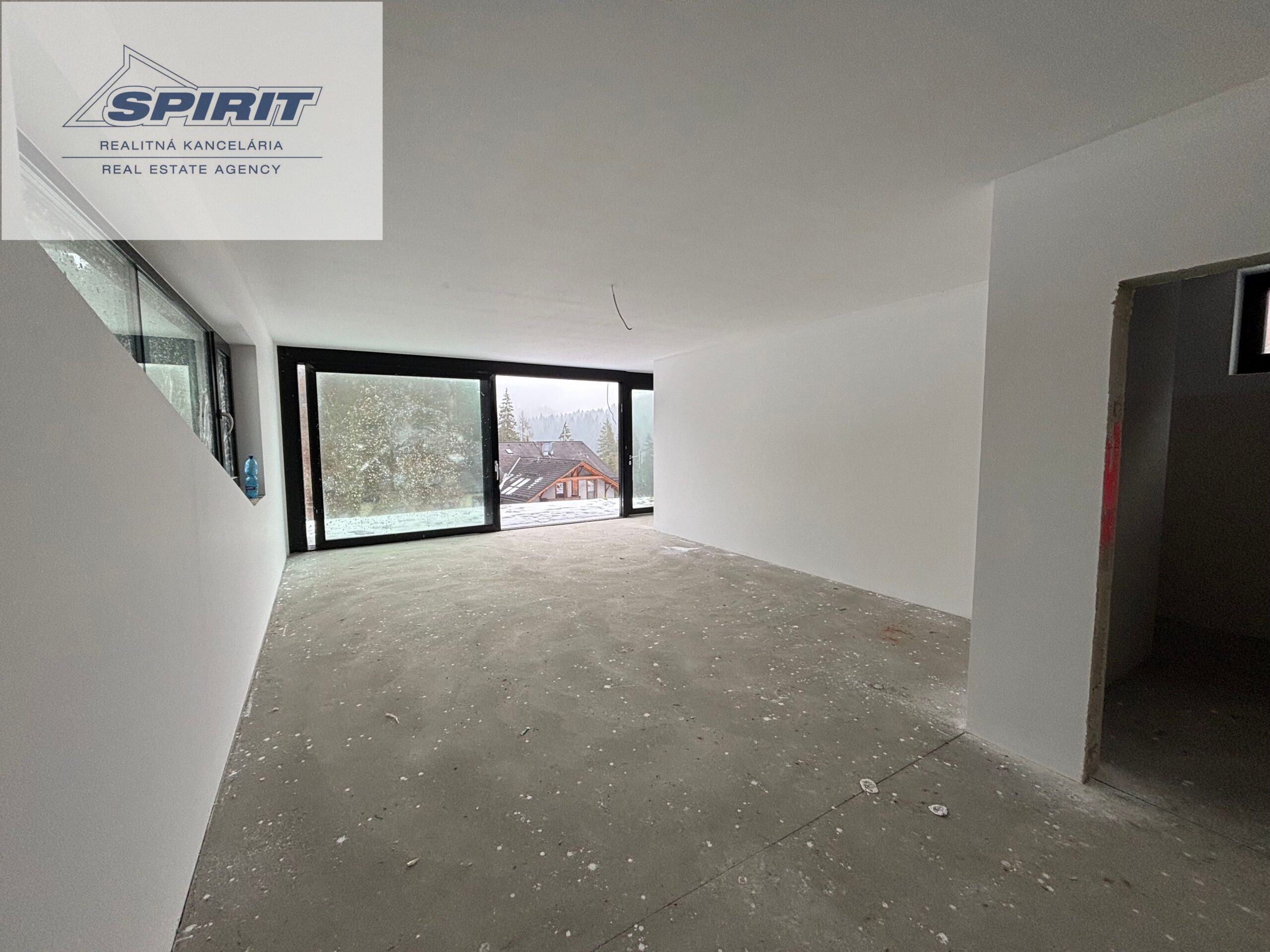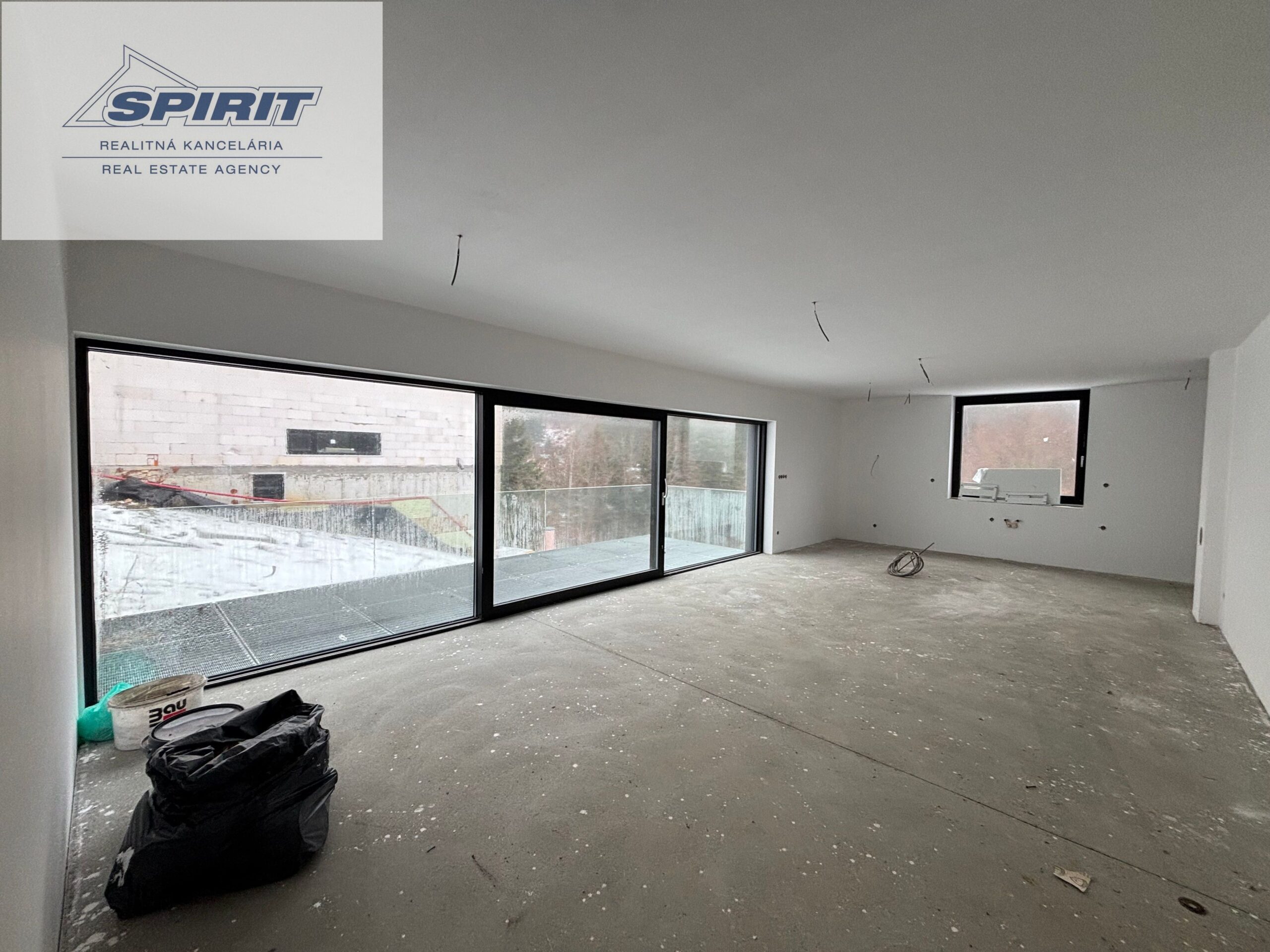 Suterén je dispozične riešený ako priestranná izba s obývacou časťou prepojenou s kuchyňou a jedálenským kútom, kúpeľňa s WC, šatník a terasa.
